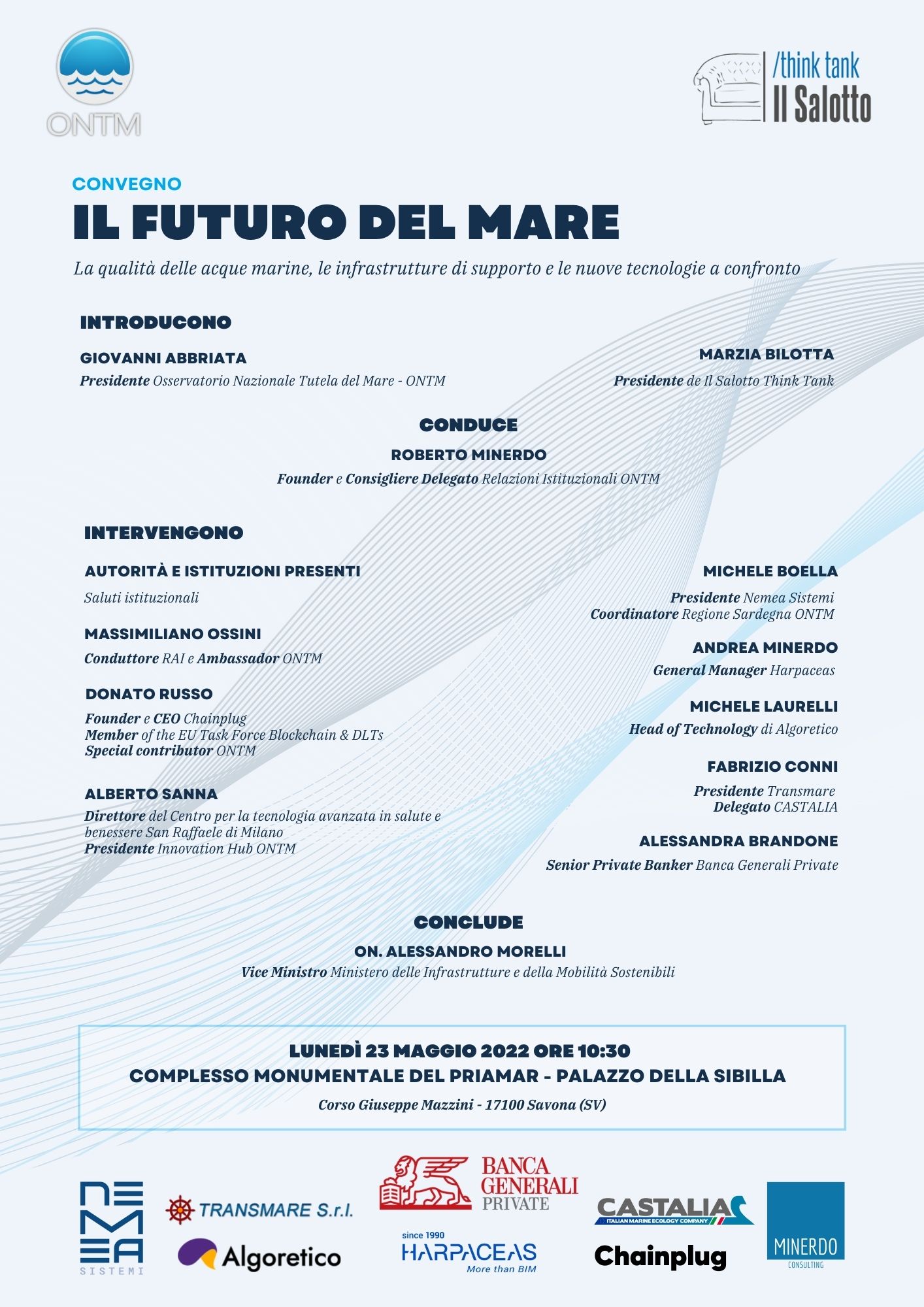 Lunedì 23 maggio, a partire dalle ore 10:30, si svolgerà presso il complesso monumentale del Priamar – Palazzo della Sibilla di Savona, il convegno Il Futuro del Mare, organizzato dall’Osservatorio Nazionale per la Tutela del Mare (ONTM) in collaborazione con Il Salotto Think Tank.